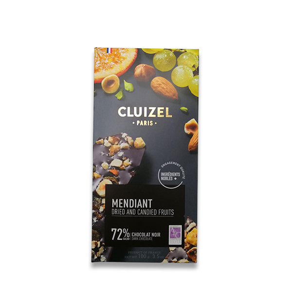 The Michel Cluizel Dark 72% & Dried and Candied Fruit is a perfect snacking chocolate, great for any time of the day. It’s particularly great for after a savory meal, to balance it out with a little sweetness. Pair it with a glass of Port, or a cup of strong black coffee.