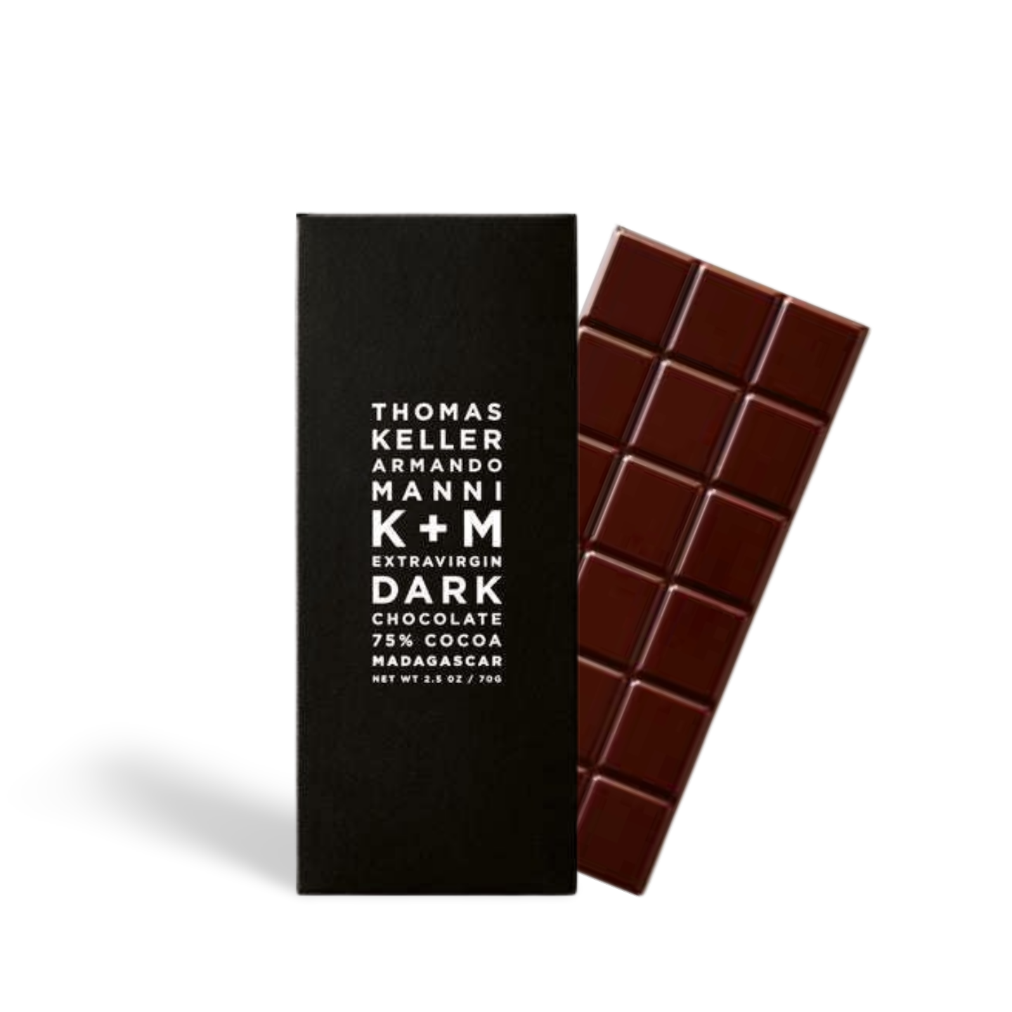 The K+M 75% Dark Chocolate is a tasty collaboration between Michelin-starred chef Thomas Keller of The French Laundry in Napa Valley, and Armando Manni, producer of legendary Italian olive oils. This chocolate is handmade in small batches in Napa, and uses a custom process to combine 75% pure cacao from a Madagascar fair trade farm with Manni Extra Virgin Olive Oil. The result is a chocolate with a silky mouthfeel, a light acidity, and a clean finish. It has bright flavors of grapefruit, and notes of rich caramel.