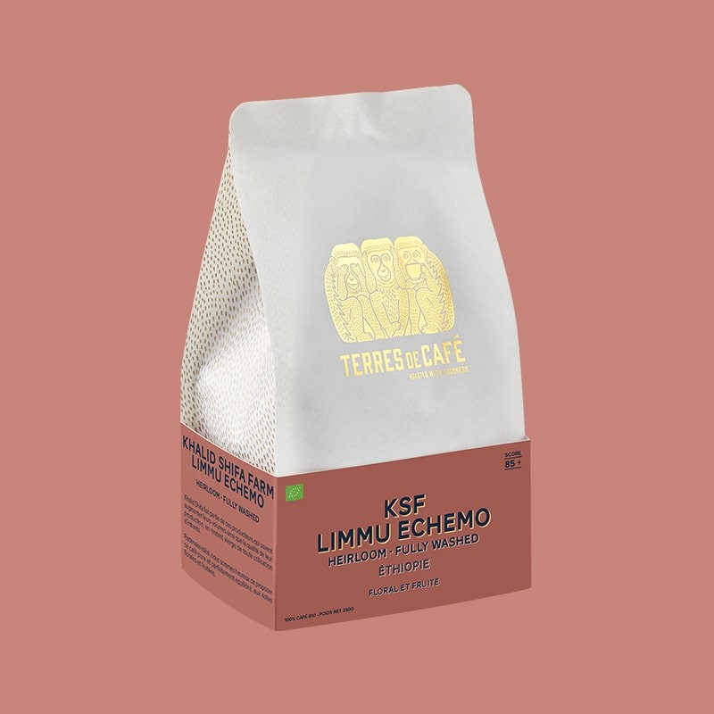 This 85+ Ethiopia KSF Limmu Echemo Heirloom Fully Washed Exceptional Grade by Terres de Café (Organic) is a unique single origin coffee that has been carefully selected and roasted in France. On the nose, it offers a bouquet of flowers, fruits and chocolate. On the palate, it has a silky body with floral notes that are complemented by peach, apricot and lemon. It has a pure and fine finish that lingers in the mouth. A great cup, airy and fruity