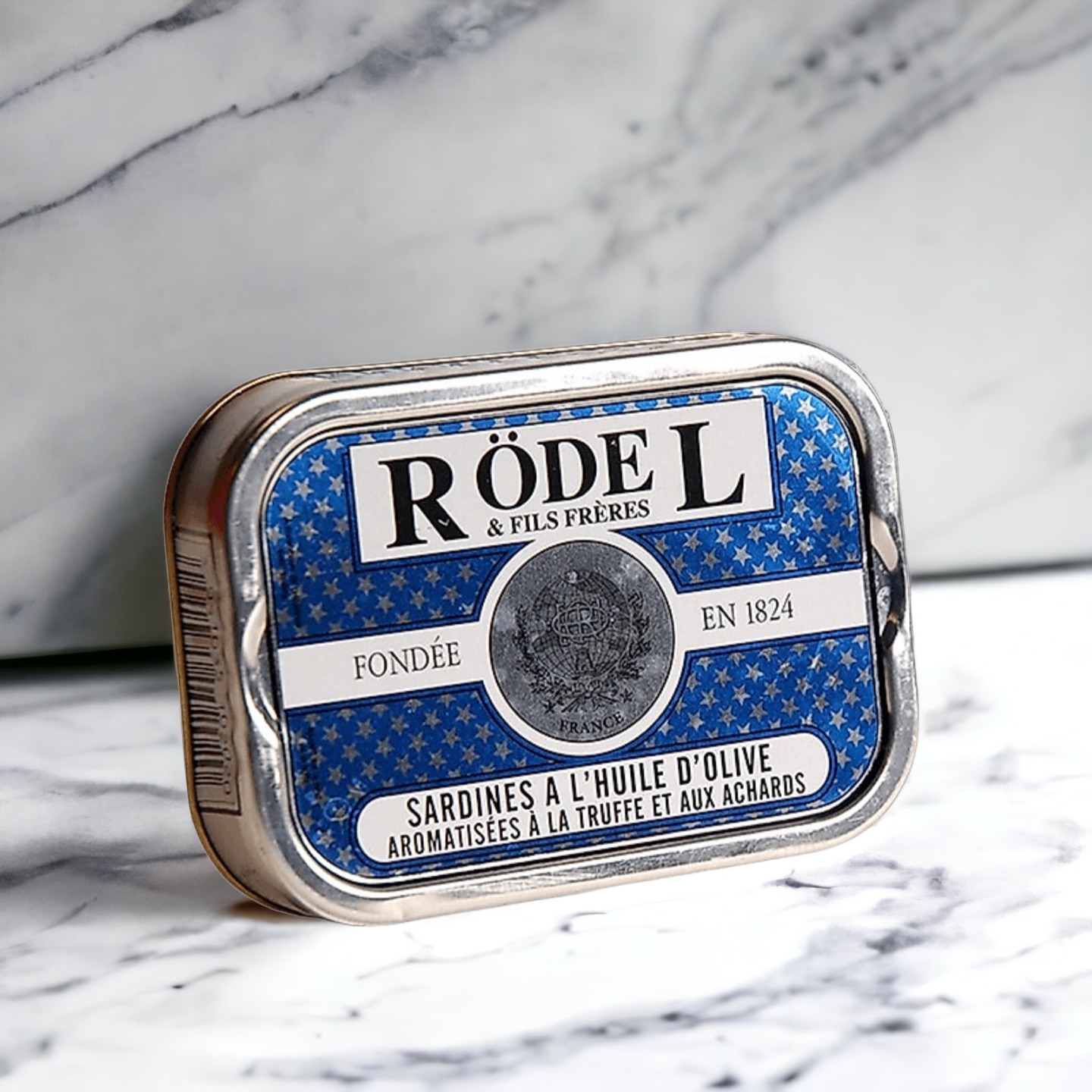 Rödel Sardines draw their lineage from the Rödel & Fils Frères, the first sardine conserverie in France. The story of these sardines begins in the rich maritime culture of Brittany, where they are sourced locally to ensure unparalleled freshness. After the sardines are laboriously cleaned by hand, they are drenched in a delicate olive oil, infused with the subtle flavours of pickles, then elevated with the earthy intensity of truffle. The journey from sea to can is a testament to the artisanal care and respect for ingredients, promising a resulting product that tells a story of culinary heritage and indulgence.