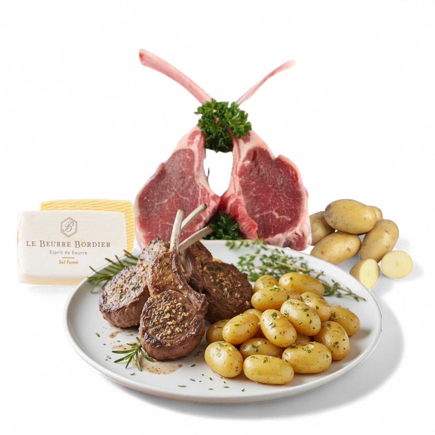 Keep the lamb cutlets frozen until ready to cook. Thaw overnight in the refrigerator before use. Store the Bordier butter chilled at 2–6°C and the Ratte potatoes in a cool, dark place.