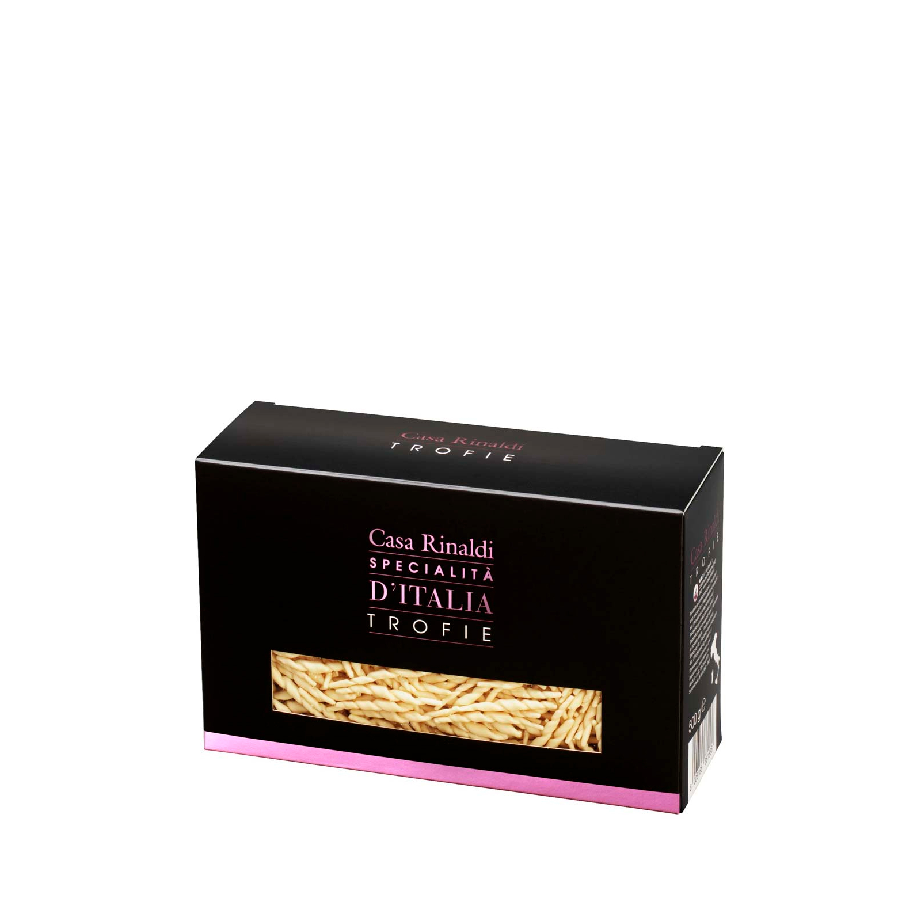 Casa Rinaldi Trofie Pasta come in the traditional short, thin, twisted shapes. They could easily be a substitute for penne or fusilli, as they also have grooves that make it easier for sauces to cling.