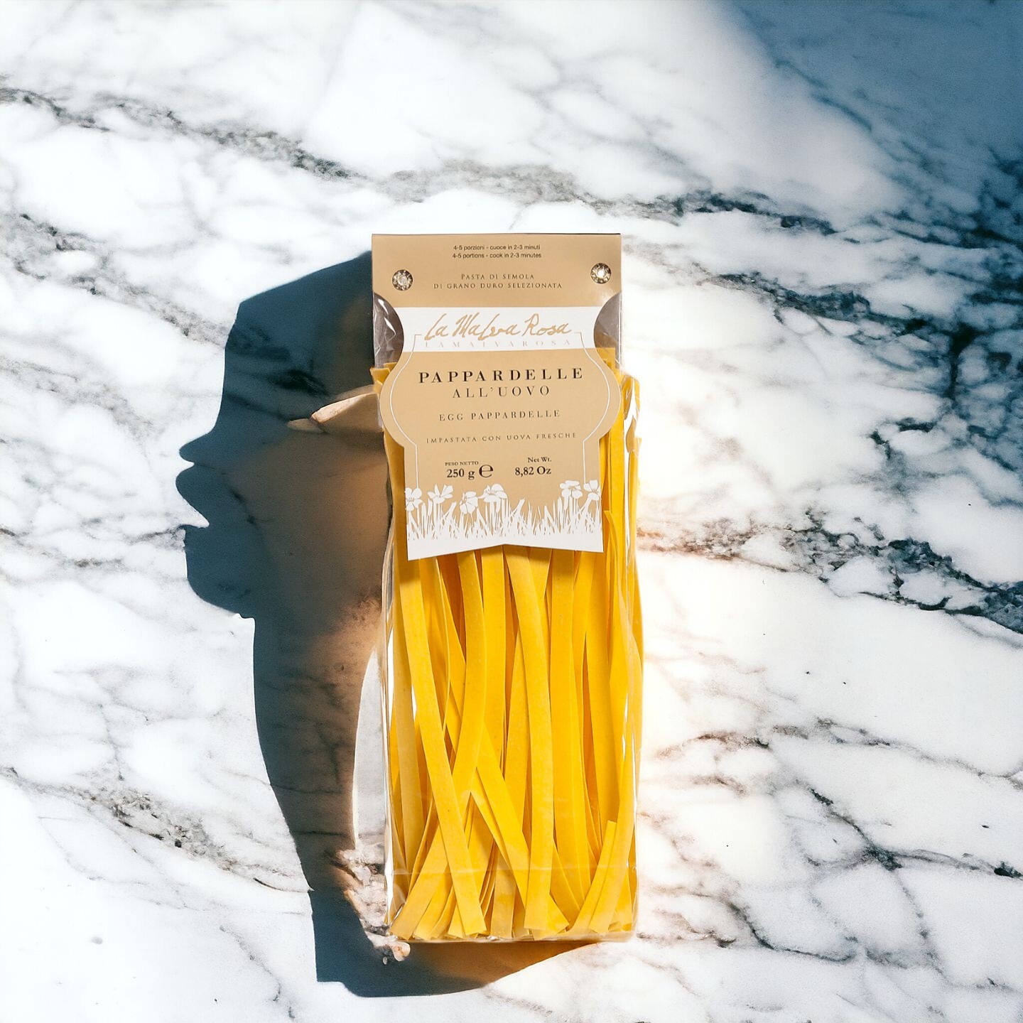 La Malva Rosa Pappardelle All’uovo enriches the palate with a creamy, ineffable egg richness, its golden threads a manifesto of its 35% fresh egg constitution. Surrender to the aroma wafting from the earthy durum wheat semolina, beckoning you to a time-worn Italian farmhouse kitchen. The flavor is both nutty and sweet, with an intimation of robustness owing to the skillful balance of ingredients and artisanal heirloom techniques. Thanks to traditional bronze die extrusion, each pappardelle ribbon possesses a rough, porous texture—an intricate labyrinth for capturing every whisper of sauce. Slow drying completes the alchemy, preserving the pasta’s integrity and enhancing the grain’s natural dance with sauce, achieving a harmonious marriage of flavors and textures upon the discerning palate.