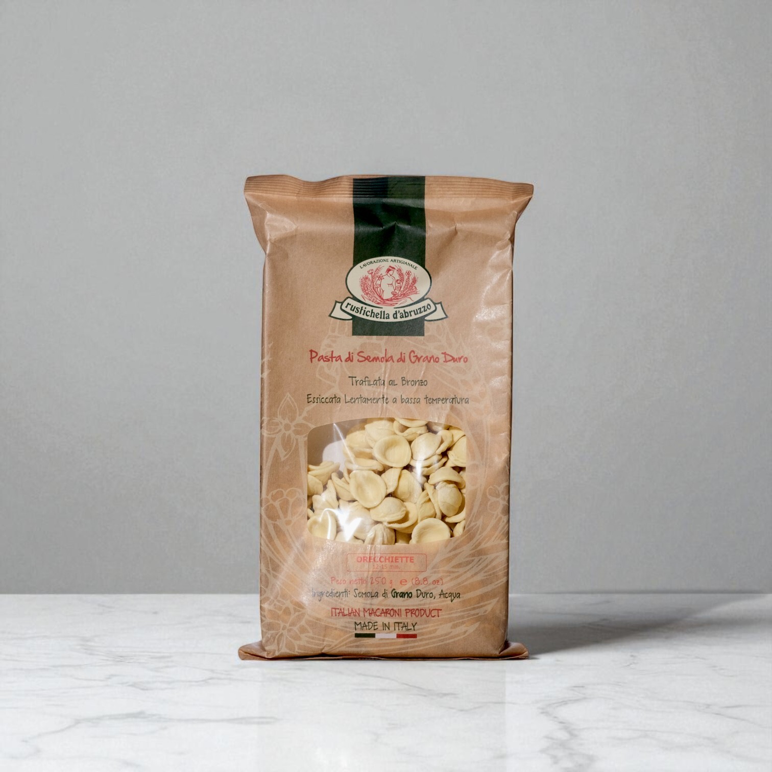 The story of Rustichella D’Abruzzo Orechiette Del Prete is deeply intertwined with the history and culture of Italy’s Abruzzo region. Established in 1924 by Gaetano Sergiacomo, Rustichella D’Abruzzo has become a beacon of traditional Italian pasta-making, exemplifying the rich culinary heritage of this region. Situated at the base of the Apennine Mountains and bordered by the Adriatic Sea, Abruzzo’s unique terroir and agricultural practices significantly influence the quality and character of its pasta. The rugged landscape supports the cultivation of heirloom durum wheat varieties, such as Senatore Cappelli, which Rustichella D’Abruzzo employs to maintain their pasta’s distinctive taste and texture. This dedication to tradition is amplified by the artisanal methods used, including bronze die extrusion and slow drying, preserving the authentic flavors and textures passed down through generations. Each piece of Orechiette Del Prete is a tribute to this legacy, capturing the essence of rural Italian life and artisanal craftsmanship. This narrative enriches the dining experience, offering a slice of Italian culture that stimulates conversation.