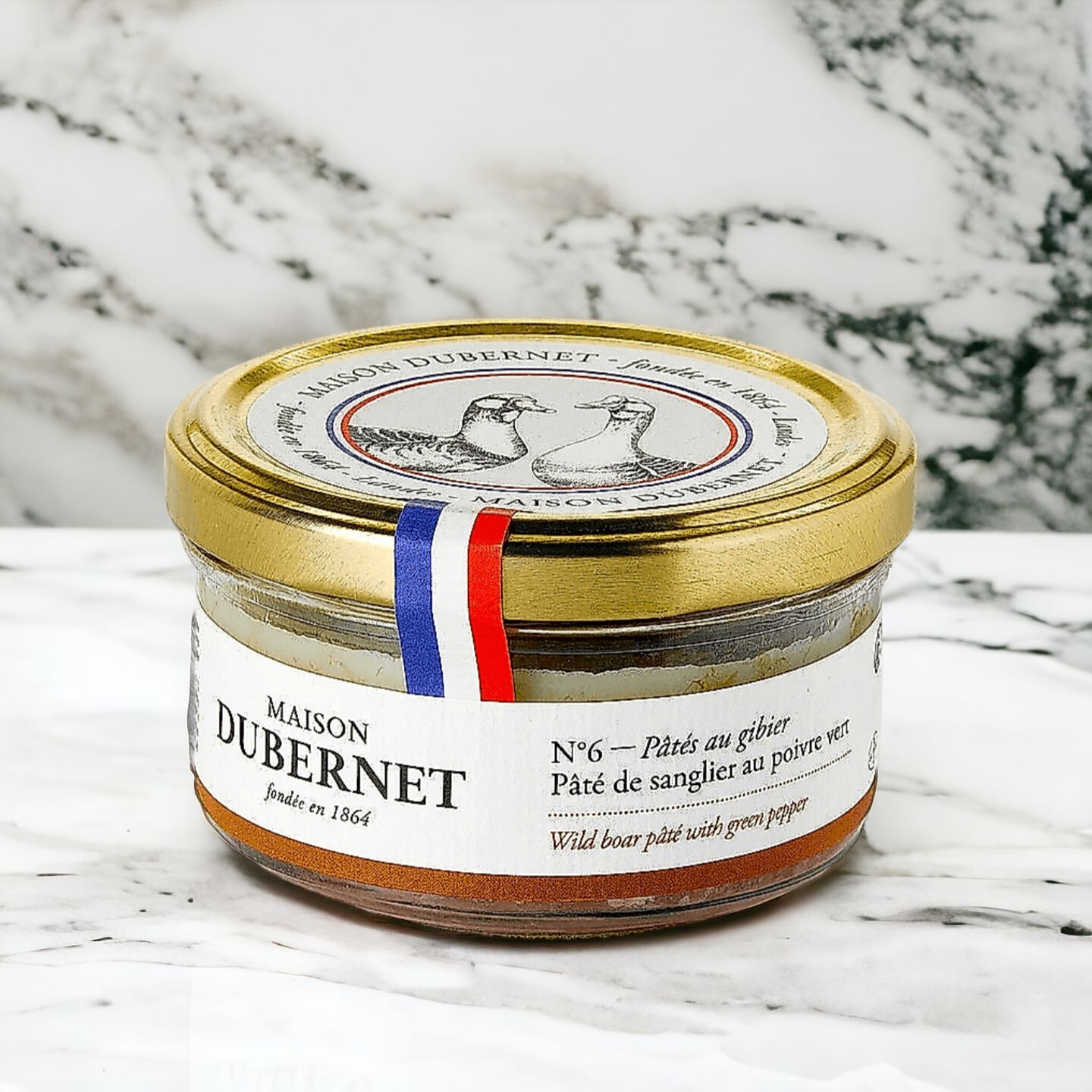 Maison Dubernet Paté de Sanglier is a masterstroke of culinary craft, meticulously assembled with a balance of 42% wild boar meat that imparts a gamey and earthy nuance, contrasting the milder, meatier notes of pork belly and liver. It is seasoned with a mélange of traditional herbs - rosemary that brings its piney, peppery whispers, green pepper coursing with fresh piquancy, and a bouquet of spices that dance on the palate; cloves punching with their pungency, nutmeg wafting with warm subtleties, ginger’s zesty embrace, coriander’s lemony-sage brush, cinnamon’s sweet, woody promise, and white pepper’s gentle heat. The paté’s symphony of flavors is heightened by the inclusion of Armagnac, a storied brandy known for its rich, dried fruit overtures, hinting at vanilla and discreet wood - an ode to the Gascony region. This culinary creation culminates in an aromatic landscape as complex as the region it originates from and as elegant as its artisanal lineage promises. The texture pays homage to traditional techniques, yielding a smooth and creamy consistency that holds its shape while possessing an effortless spreadability on bread or crackers. The mouthfeel is unabashedly rich, cloaking the palate in a velvety embrace that lingers, urging one to pause and savor the depths of its complex character.