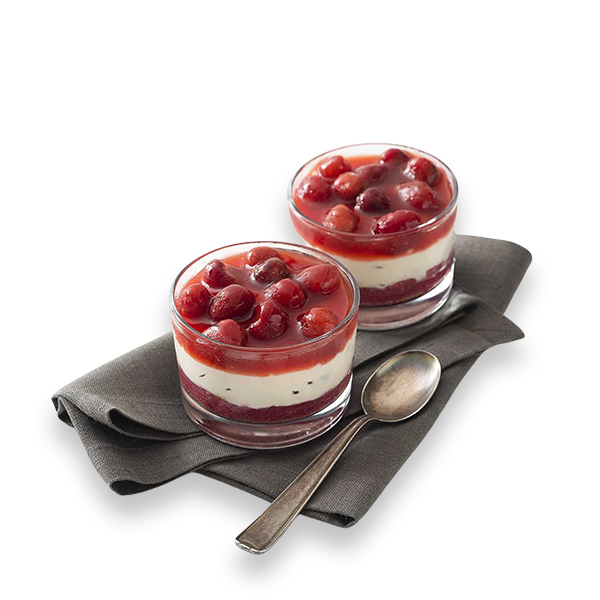 The Bindi Coppa Mascarpone and Strawberry is made with a strawberry sponge cake base, layered with mascarpone cream dotted with chocolate chips, and topped with strawberry sauce and wild strawberries. These are all arranged in elegant glass cups, ready to serve. This treat is creamy, sweet, and subtly tart.