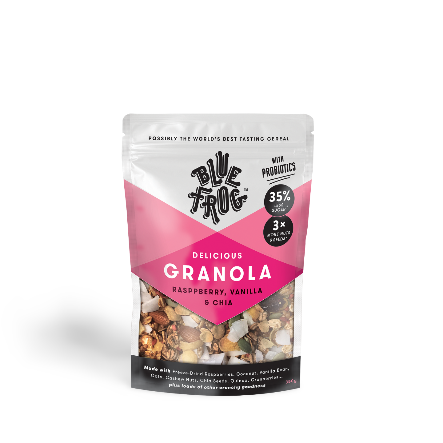 Enjoy the Blue Frog Raspberry, Vanilla & Chia Seeds Granola on its own as a snack, or a quick energy boost when you’re on the go. It’s great as breakfast to start your day with; enjoy it with some plant-based milk or some yogurt.
