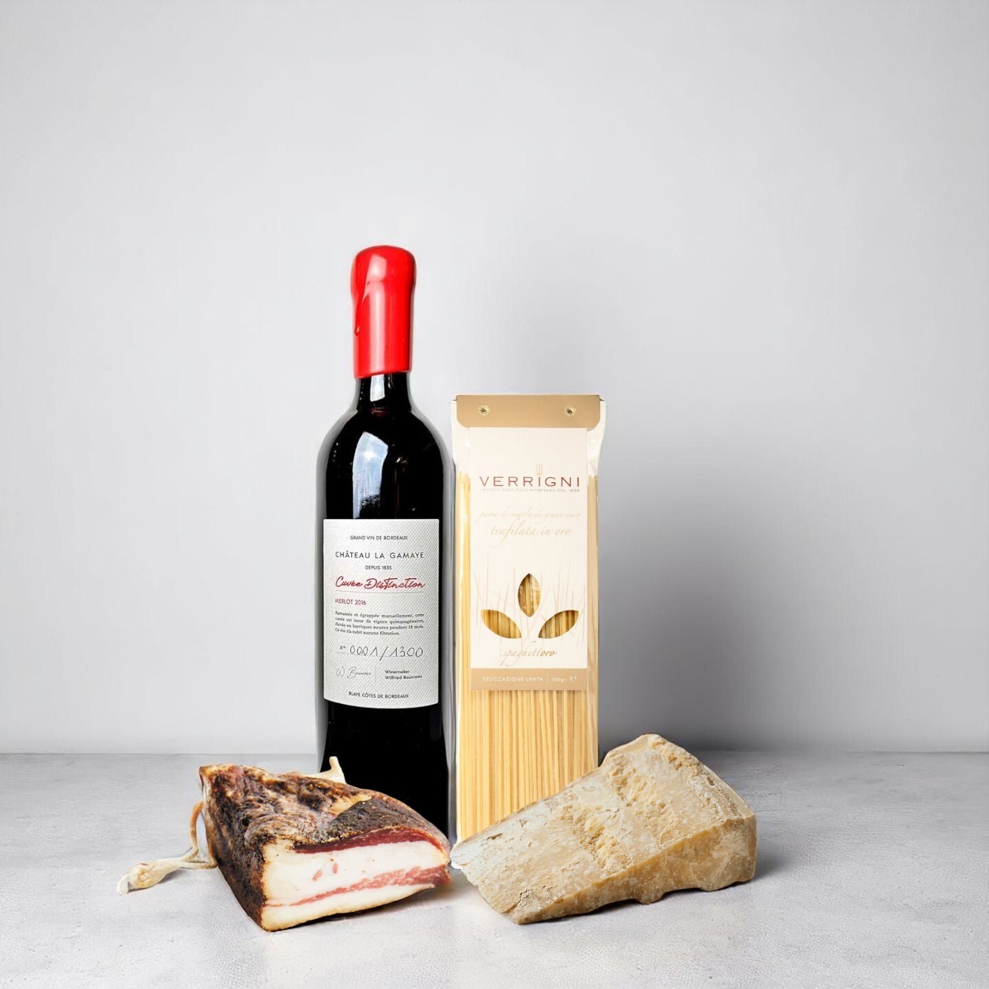 Parmigiano Reggiano: Wrap in wax or parchment paper, then place in an airtight container in the fridge. Consume within 3–4 weeks once opened. Guanciale: Keep refrigerated and tightly wrapped. Use within 10 days once cut or freeze in portions. Verrigni Pasta: Store in a cool, dry place away from light. Wine: Store horizontally in a cool, dark place. Chill slightly before serving.