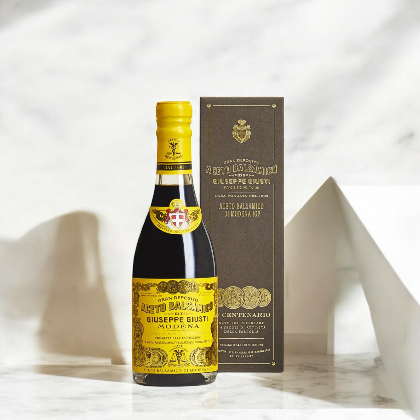 The Giuseppe Giusti name is synonymous with the finest balsamic vinegars in Modena, a tradition that has unfolded since the 17th century. This legacy is one that spans centuries, enriched by the cultural heritage of Modena and the unwavering dedication of the Giusti family. The “4 Gold Medals” Balsamic Vinegar holds a place of honor, its creation perfected through generations of expertise. What makes Giusti unique is not just their meticulous aging process but their commitment to preserving the authentic craftsmanship of balsamic vinegar production, ensuring that every bottle is a tangible piece of Italian history. The Giusti family lore is not just a story—it’s a living tradition, each batch a tribute to time-honored methods passed down through the ages. This bottle embodies that heritage, offering a sensory journey through centuries of balsamic excellence.